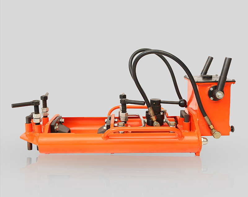 作业时,将推凸机骑放在焊瘤两侧钢轨上,使导向装置靠紧钢轨腭部,然后往复摇动液压泵站上的手柄,随着油缸活塞杆伸出,推凸刀相对移动,产生剪切力从而切除焊瘤。